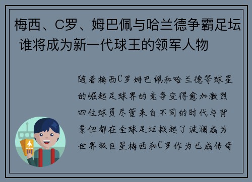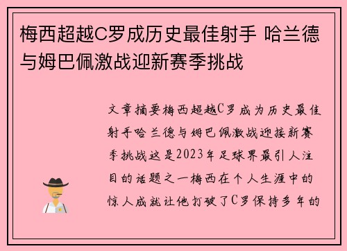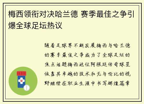 文章摘要的内容1、梅西效应在美国足球的影响梅西加盟国际迈阿密俱乐部,带来了对美国足球的巨大影响。首先,他的加盟引发了媒体和公众的广泛关注,推动了美国足球市场的发展。其次,梅西的到来激发了年轻球员的梦想,加速了青少年足球项目的普及和提升。最后,他在场上的表现和领导力,不仅提升了球队的竞争力,也增加了美国足球在全球的影响力。文字阐述内容文字阐述内容文字阐述内容2、梅西加盟对美国足球联赛的商业价值影响梅...