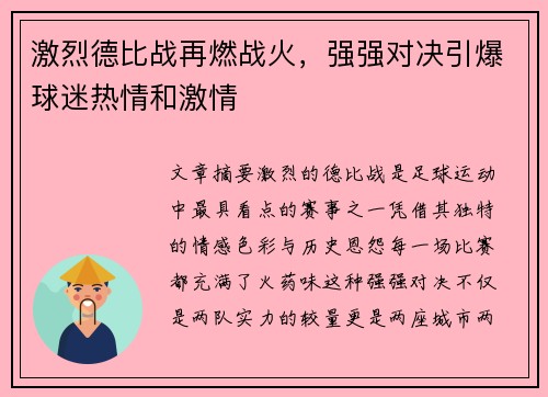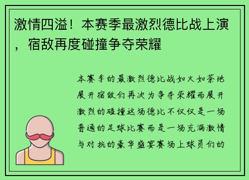 在即将到来的意甲豪门大战中,尤文图斯将主场迎战AC米兰,这场比赛不仅是一场传统豪门的对决,更是关乎欧冠资格的生死战。两队目前在积分榜上都紧密相连,尤文图斯以微弱优势领先米兰,而米兰则在最后阶段拼劲十足,力争超越对手。比赛不仅关乎两队的荣誉,更意味着谁能拿到下赛季欧冠资格的重要一战。通过对两队近期表现、战术布置、关键球员及历史对阵记录的分析,我们将全面解读这场比赛的看点与影响,探讨谁能笑到最后,赢得...