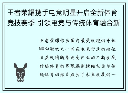 文章摘要:王者荣耀职业联赛(KPL)作为中国最受欢迎的电竞赛事之一,历年来吸引了无数玩家与粉丝的关注。今年的KPL决赛落幕,新晋冠军战队的崛起不仅刷新了竞技格局,也引领了电竞产业的新风潮。本文将从四个方面详细探讨这一现象:新冠军战队的崛起与其背后的团队力量、赛季赛制的变化如何促进电竞竞技水平的提升、电竞产业的可持续发展与年轻人文化的融合、以及电竞职业化与社会认同感的逐步建立。这些方面不仅体现了KP...